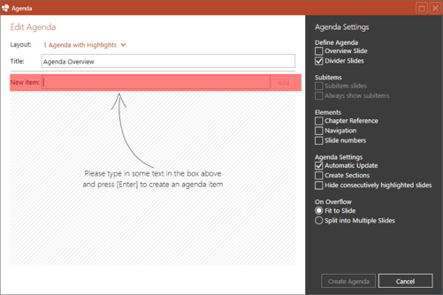 - If the agenda contains so many items that they no longer fit on a single slide, the entire agenda can either be automatically resized to fit the size of the slide or it can be distributed across multiple slides. You can now move them within your presentation or insert additional content slides between the Agenda slides. Chapter headings and navigation are now automatically on all content slides. The chapter headings show the complete path of the current agenda item including all levels.